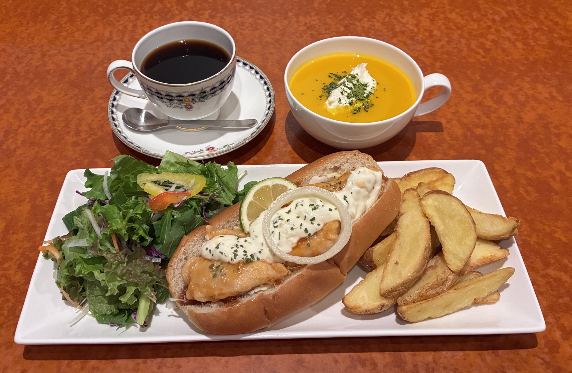 大分の美を特集する今回の展示にインスピレーションを得て考案しました。大分名物のとり天をアレンジしたホットドッグに狩野派の金屏風、大友宗麟の茶道具をイメージした南瓜&抹茶のポタージュスープをセットにいたしました。この機会にぜひお召し上がりください。